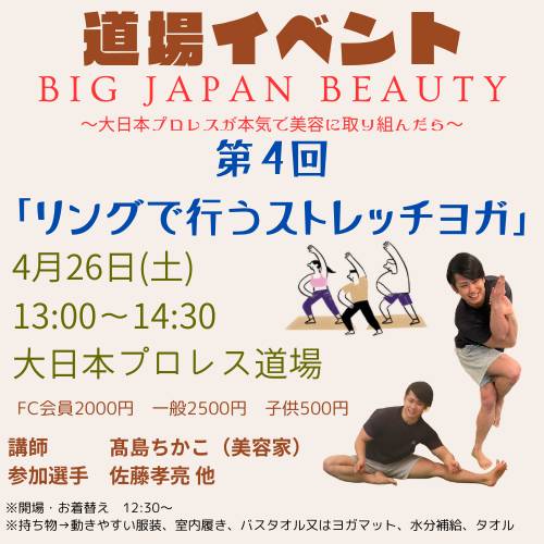 次回の道場イベント開催決定!!4/26(土)大日本プロレス道場イベントBIG JAPAN BEAUTY 第4回「リングで行うストレッチヨガ」情報