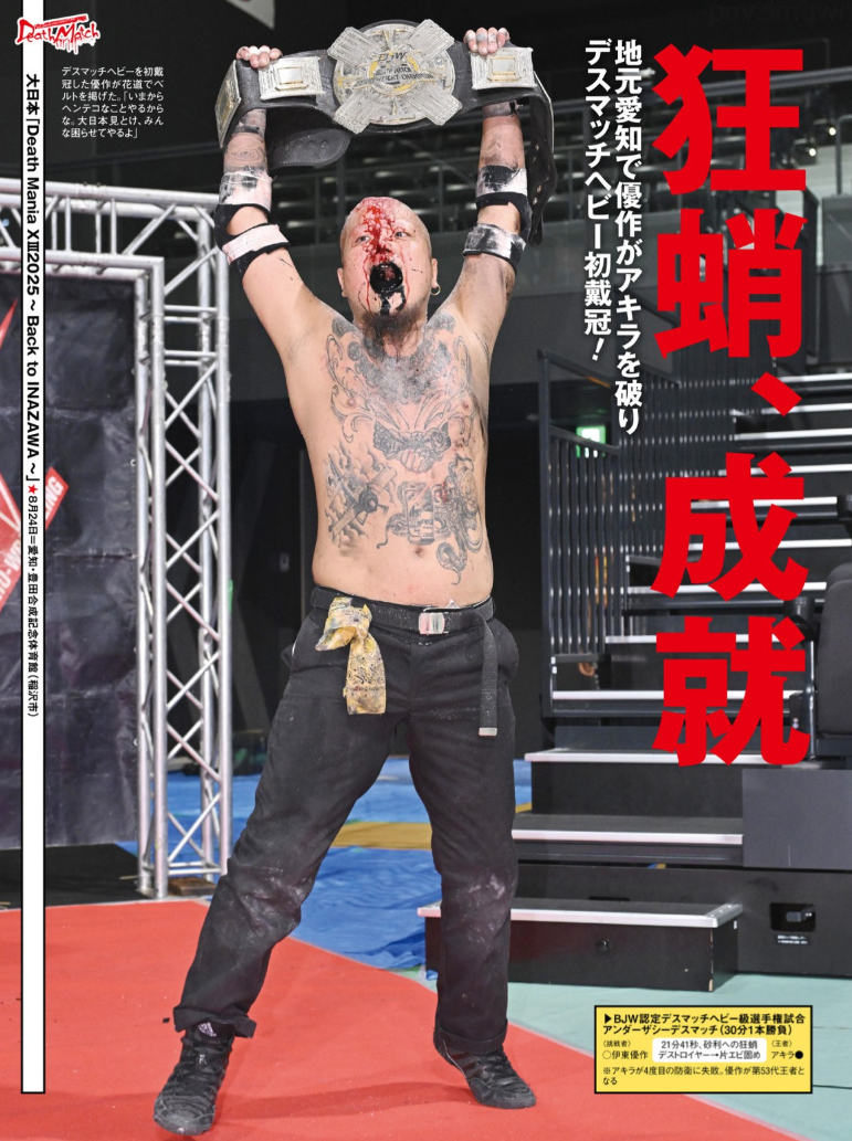 週刊プロレス今週号では、スペシャル&3大タイトルマッチがおこなわれた愛知ビッグマッチ、8・24稲沢大会をリポート! また、チャンプトークにはBJW認定タッグ王者の星野勘九郎が登場!