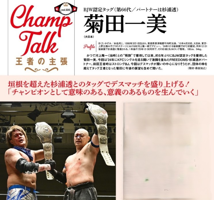 週刊プロレス今週号では、連載「王者の主張」にBJW認定タッグ王者・菊田一美が登場! 1・31後楽園の初防衛戦に向けてなど語っています。
