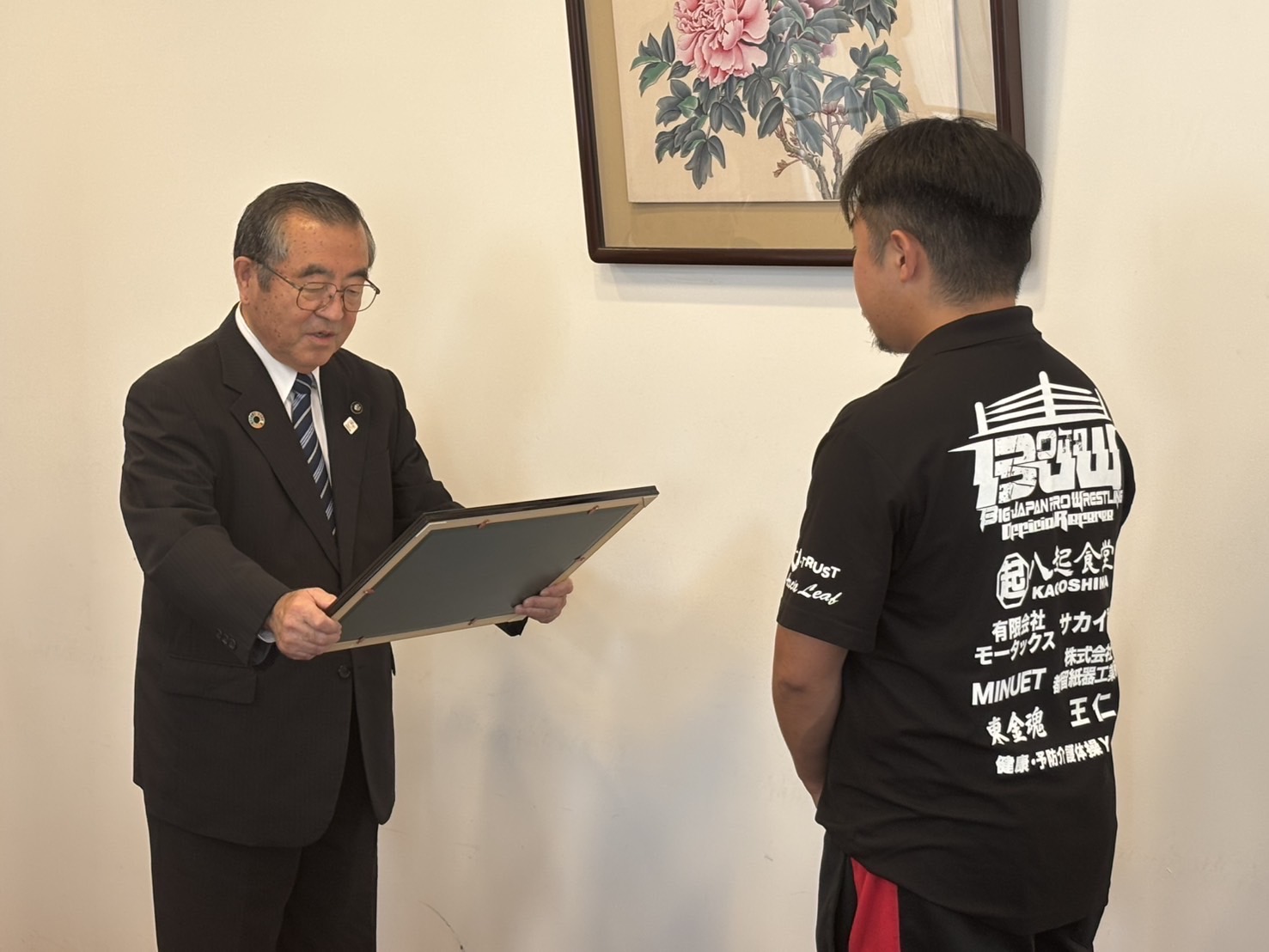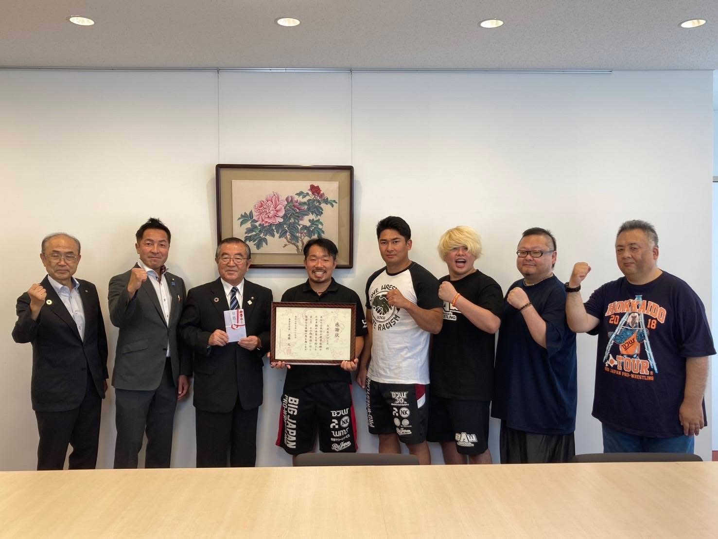 2025年9月10日(水)、青木優也選手・花見達也選手(2AW)・中谷諒平レフェリーが喜多方市の遠藤忠一市長を訪問し2025年6月14日に開催した「〜笑顔の種蒔き第3章 発芽〜」福島県・喜多方市塩川体育館大会の売り上げの一部をお渡ししました。 遠藤市長からは感謝状を頂戴し、寄付金は喜多方市の教育振興に使用される予定となっています。 大日本プロレスは今後も様々な形での社会貢献に取り組んで参ります。