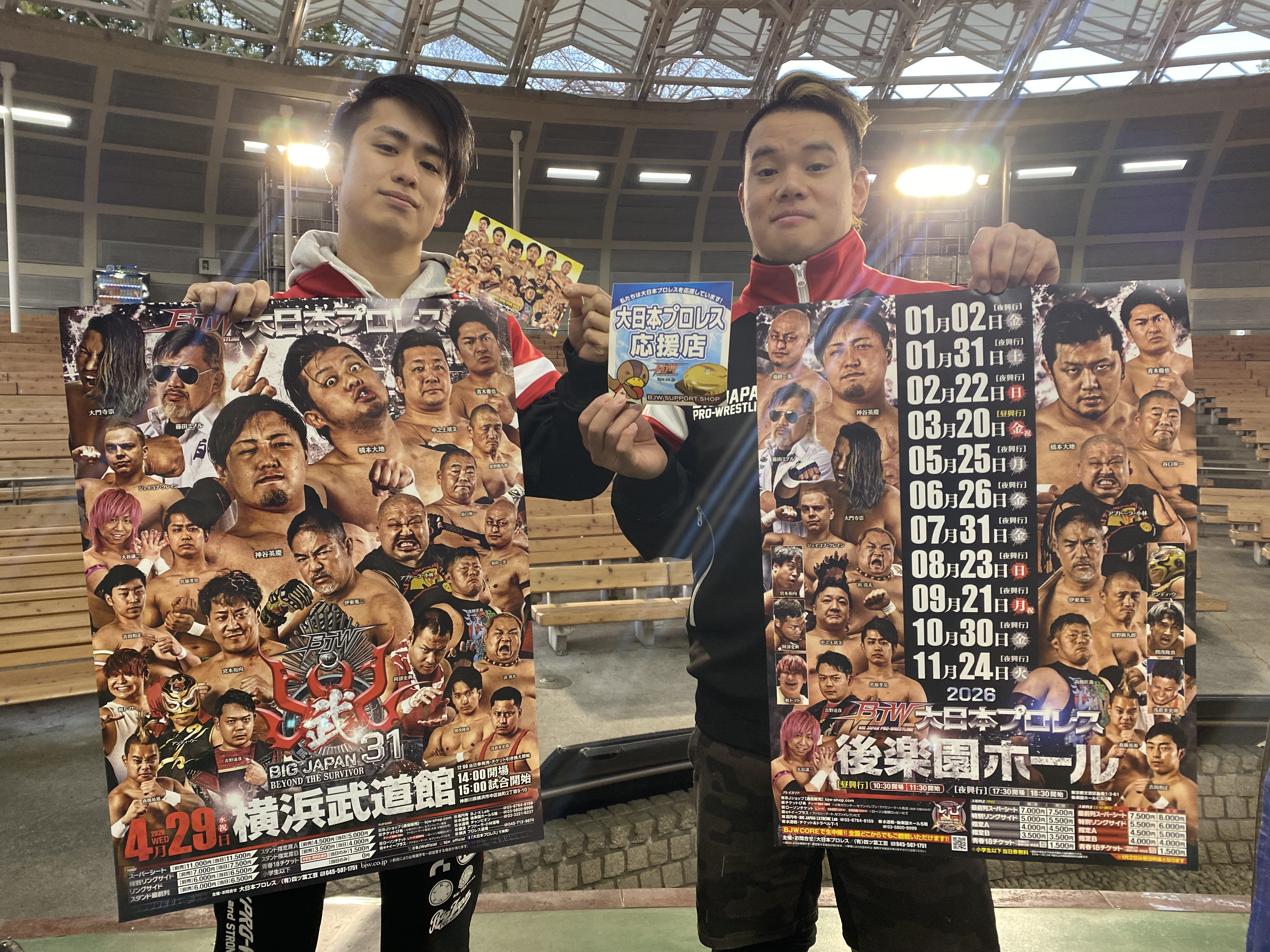 | キャンペーン内容 | ご登録の住所に下記をお送りします。 ①2026年大日本プロレス年賀状 ②2026年大日本プロレス後楽園ホール大会年間ポスター ③2026年4月29日大日本プロレス横浜武道館大会ポスター ※折りたたんだ状態でお送りします。ぜひご掲示いただき大日本プロレスのPRにご協力ください。 ④大日本プロレス応援店ステッカー(新規ご登録の方のみ) |